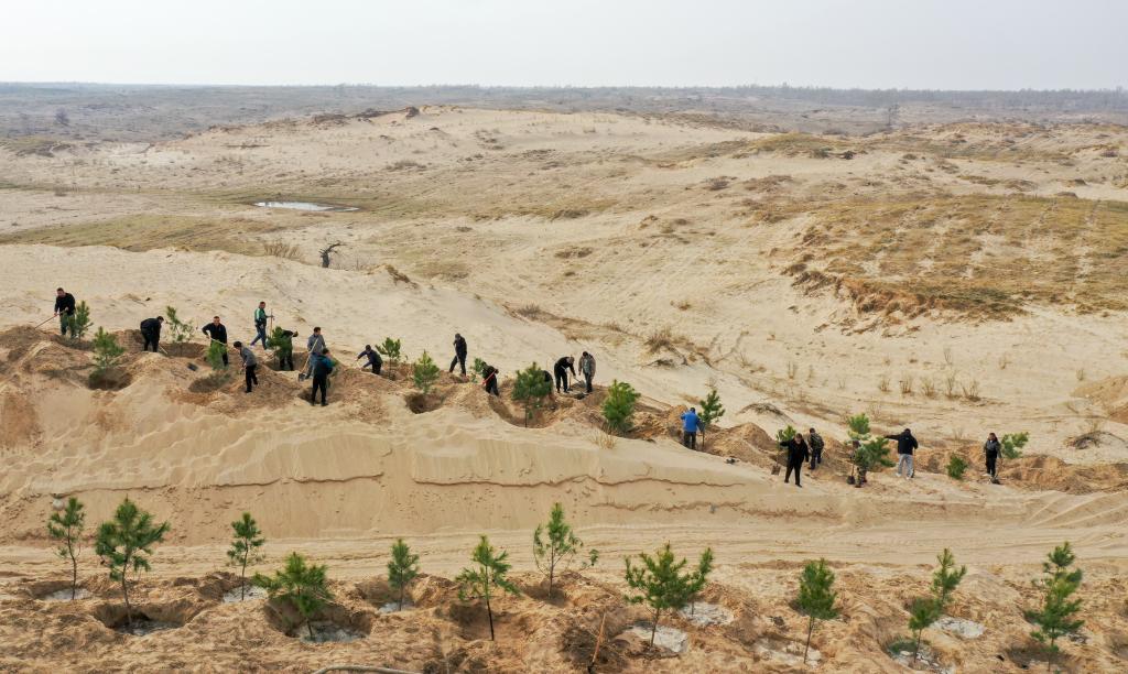 2023年4月15日,在内蒙古通辽市科尔沁左翼后旗,治沙工人在科尔沁沙地植树造林(无人机照片)。新华社记者 连振 摄