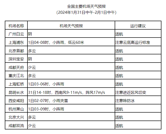 31日傍晚至2月1日上午,银川、太原、石家庄、济南、青岛等机场先后有小雪,西安、郑州等机场有小雨夹雪或小雪;31日夜间,长沙、南昌等机场有中阵雨,短时雷雨;31日午后至夜间,江苏东部、上海、浙江东部、广东南部、海南北部等沿海地区通航机场受海雾低云影响,请加强关注;另外,31日夜间至2月1日中午,湖南北部、江西北部、浙江西部等地航路有分散对流。