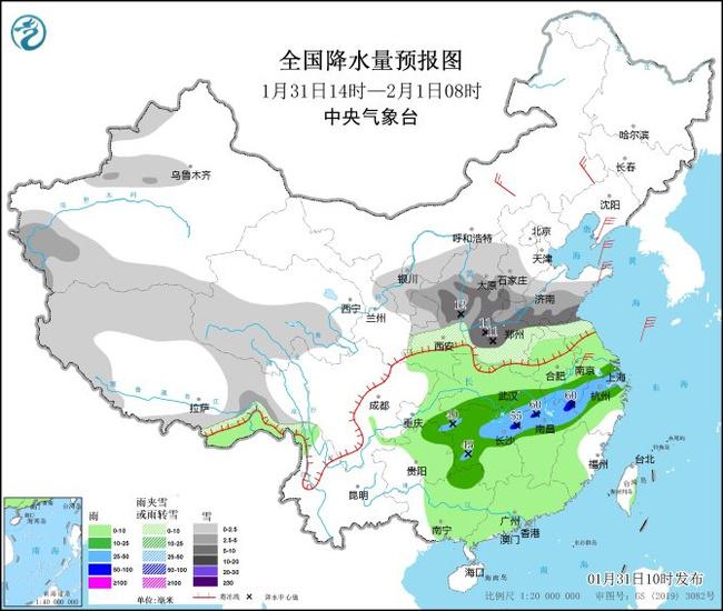 1月31日下午至夜间,新疆伊犁河谷和南疆盆地、西藏、青海南部、西北地区东部、华北西部、黄淮等地有小到中雪或雨夹雪,陕西中北部、山西中南部、河北西南部、山东南部、河南中西部和北部等地有大雪,局地暴雪(10~12毫米);江淮西部、江汉东部、江南北部和西部、西南地区东南部等地有中到大雨,局地暴雨(50~60毫米,见图2)。