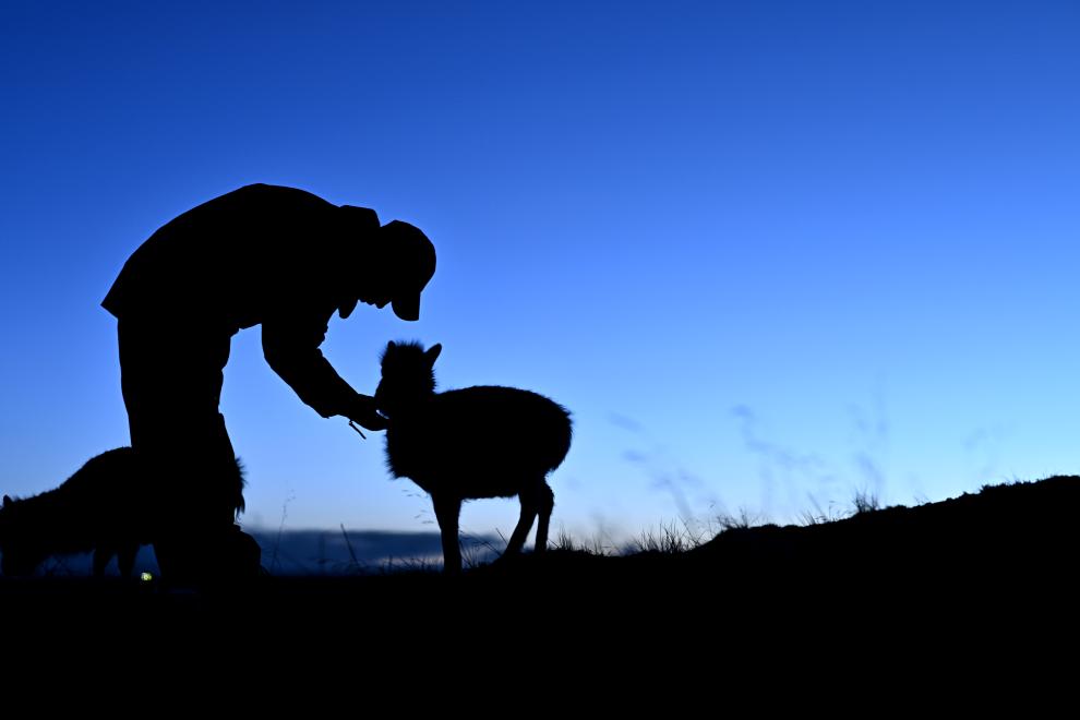 用卫生纸简单擦拭流血的手指后,才文多杰和同伴一起在小围栏里数羊:“一只,两只,三只……一共九只,一只也不少。”说话间,才文多杰蹲下身子观察围栏内藏羚羊留下的粪便。“这九只小藏羚羊都是这几年巡山队员陆续从可可西里卓乃湖救助回来的,冬天天气冷,最怕它们闹肚子。”才文多杰说。