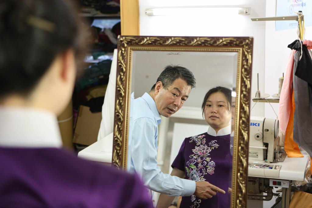 ↑2023年5月30日,江满宗在上海市“龙凤旗袍”门店为顾客挑选旗袍。