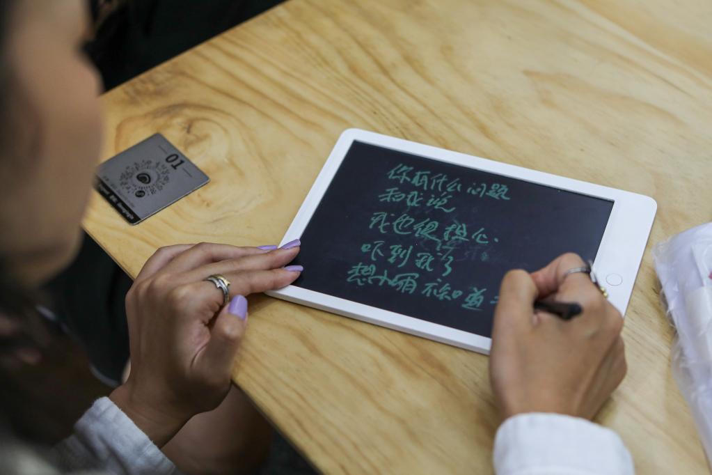 ↑2023年8月10日,“无声咖啡馆”店长小雨(左)与顾客交流。