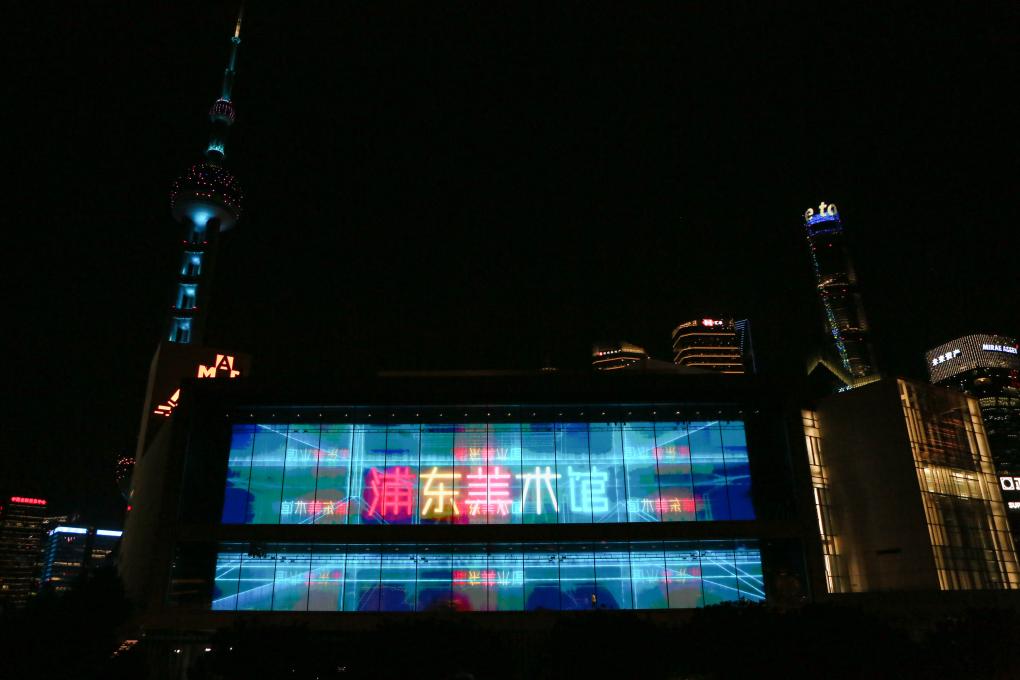 ↑这是2023年7月13日拍摄的浦东美术馆镜厅灯光秀。