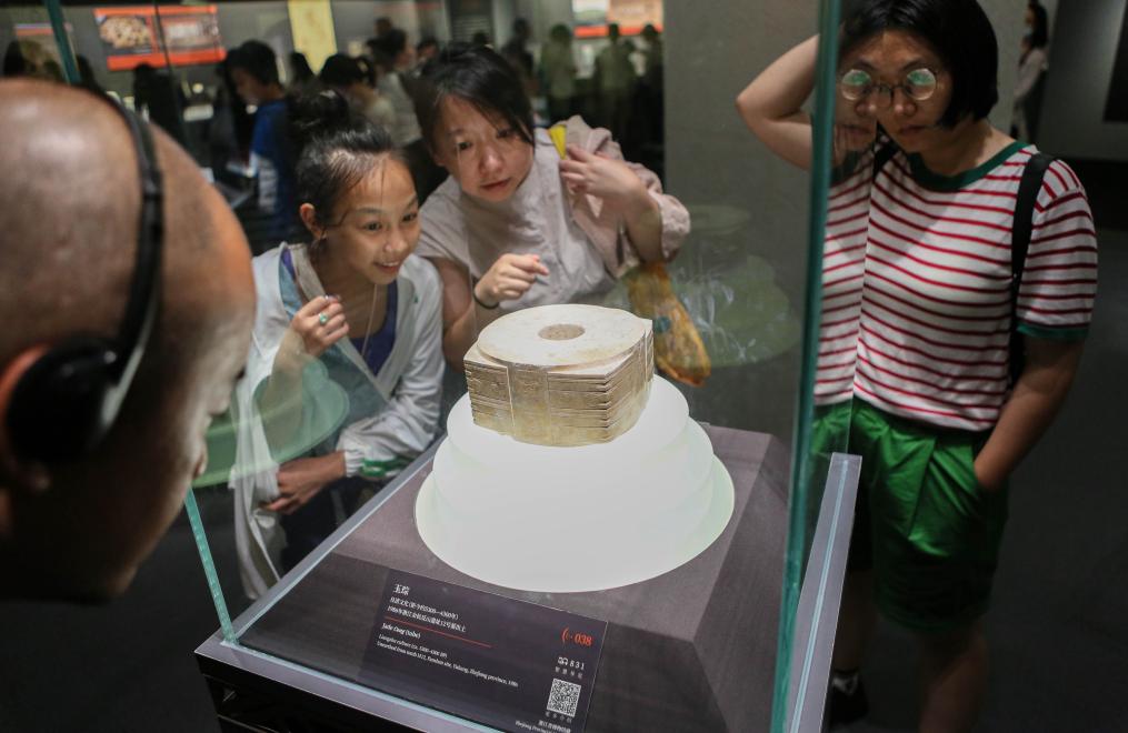↑2023年7月14日晚,参观者在上海博物馆“实证中国:崧泽·良渚文明考古特展”观看玉琮。