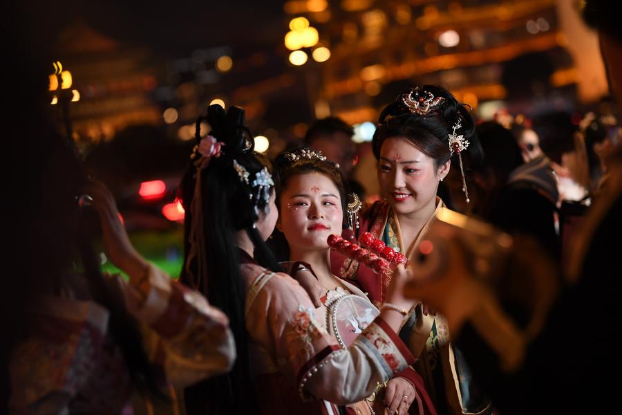 2月13日晚,来西安旅游的游客身穿汉服体验“夜游长安”。新华社记者 李一博 摄