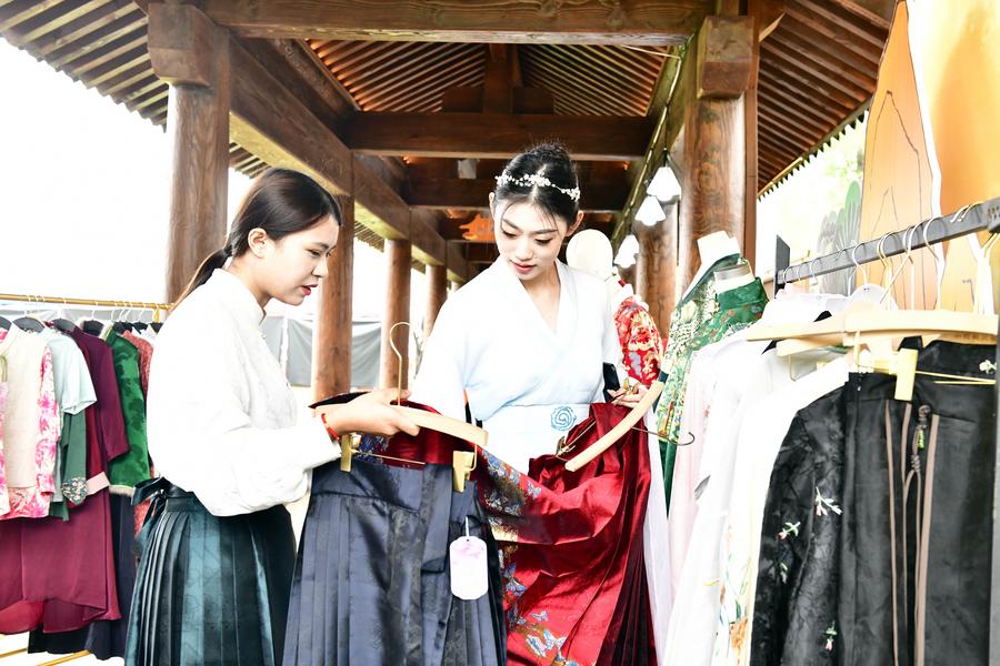 2023年9月26日,在第九届尼山世界文明论坛“山东手造”精品展区,与会人员在挑选曹县汉服。新华社记者 郭绪雷摄