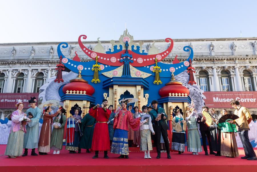 2月13日,在意大利威尼斯,志愿者身着汉服进行表演。新华社记者 李京 摄