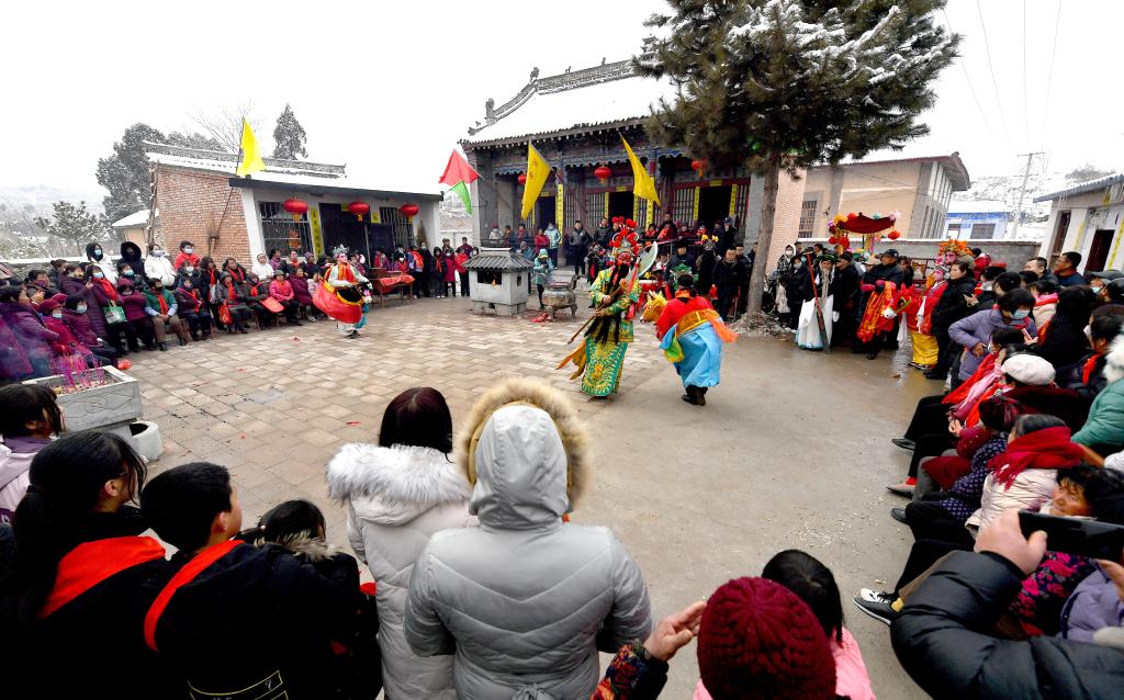 陕西省宝鸡市陇县东南镇黄花峪村在进行地台社火表演。新华社记者 刘潇 摄