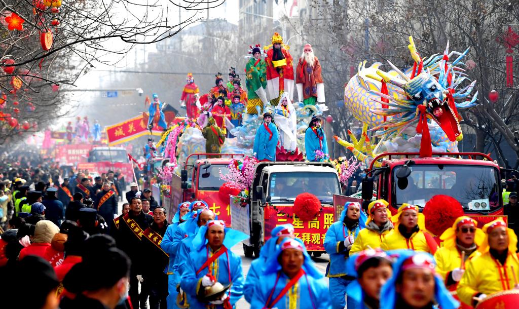 陕西省宝鸡市陇县社火巡游活动上,社火队伍在展示背芯子。新华社记者 刘潇 摄