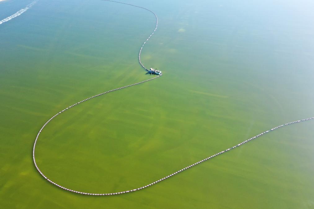 3月14日,青海盐湖工业股份有限公司钾肥分公司的采盐船在盐湖工作(无人机照片)。新华社记者 陈杰 摄