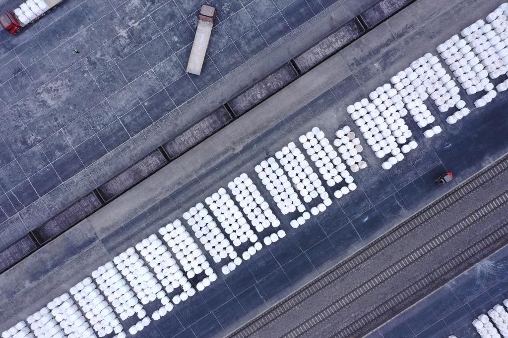 在察尔汗车站的货场上,数十辆叉车往来穿梭,将堆积的钾肥送进车厢。铁轨上满载着钾肥的专列将从这里出发,通往全国各地。