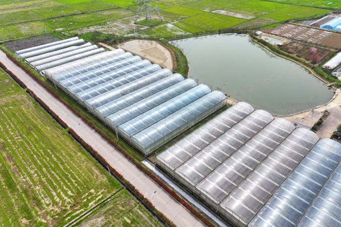 这是3月22日在湘潭市雨湖区姜畲镇棋盘村拍摄的智能蔬菜温室大棚(无人机照片)。新华社记者 陈泽国 摄