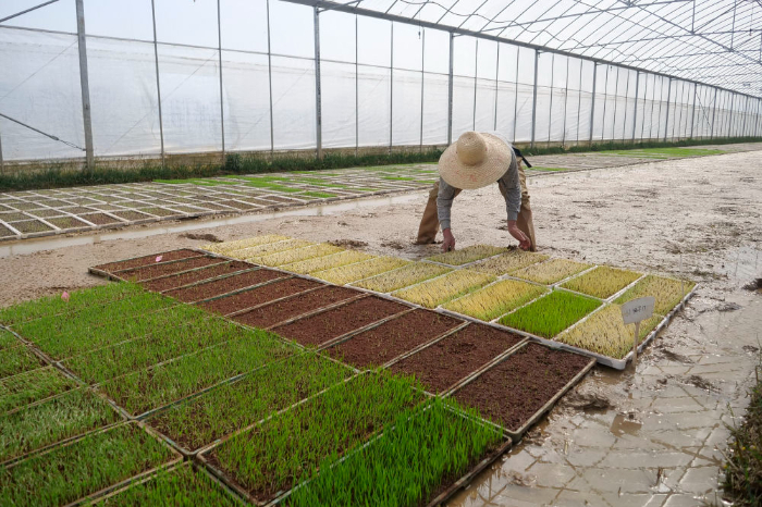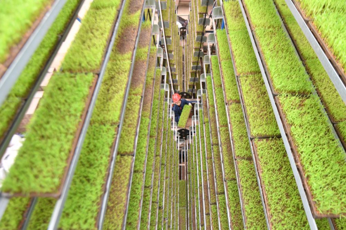 在江西省宜春市上高县水稻科技小院育秧站,出芽的秧苗被送入育秧大棚培植。新华社记者 郭杰文 摄