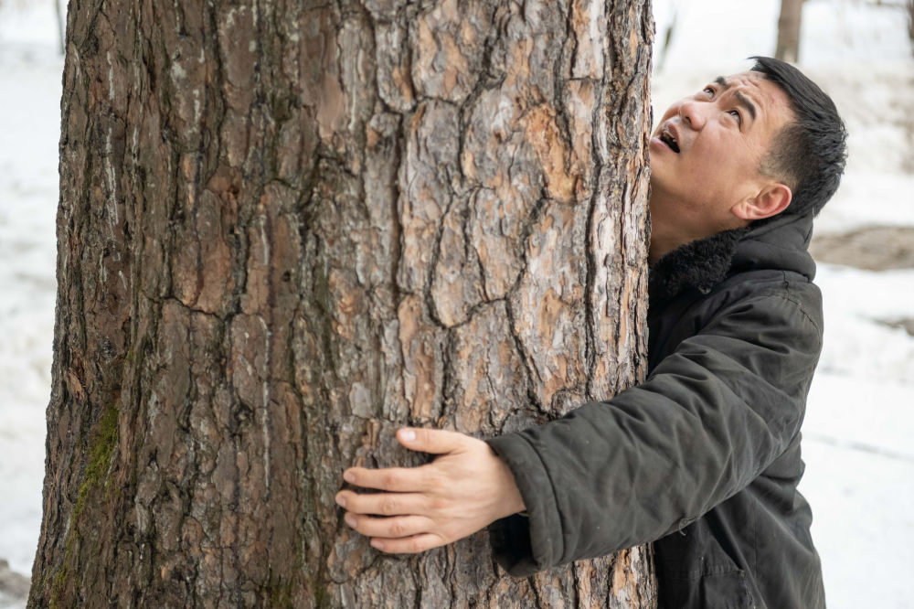 在伊春市丰林县,五营国家森林公园经理助理崔健华伸展手臂试着抱住一棵红松(2024年3月13日摄)。新华社记者 谢剑飞 摄