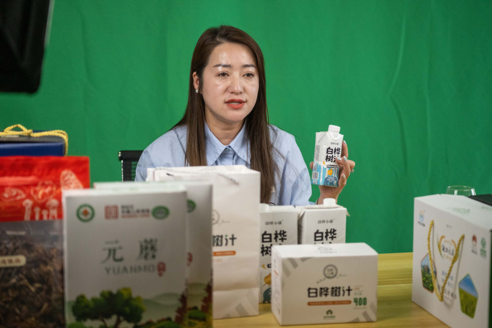 在伊春森工电子商务产业园,电商主播直播售卖桦树汁(2024年3月12日摄)。新华社记者 谢剑飞 摄