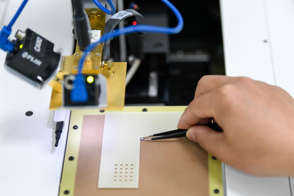 在天府新区集成电路设计创新公共平台工作间内,工作人员将待检芯片放上操作台,测试静电的潜在破坏作用。新华社记者胥冰洁 摄