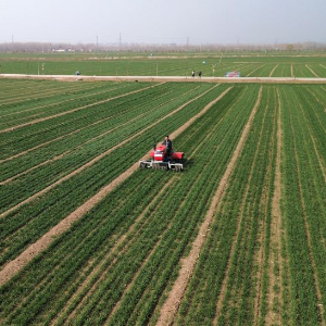 山东省汶上县,农民驾驶农机在高标准农田里进行小麦春季管护作业(2024年3月13日摄,无人机照片)。新华社记者 徐速绘 摄