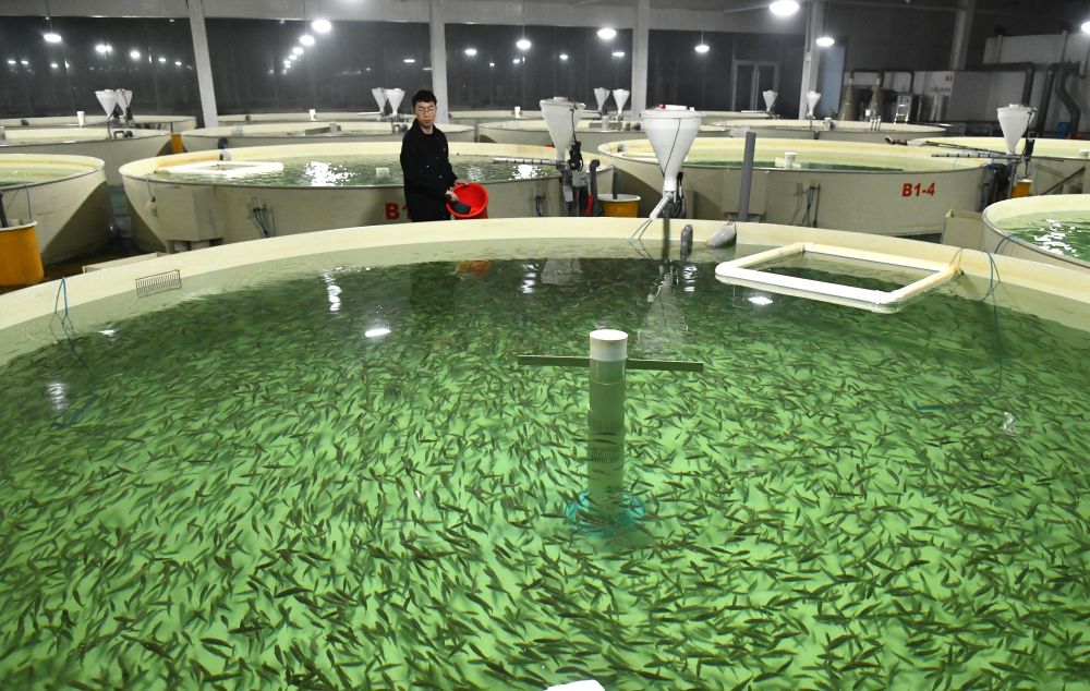 山东省微山县微山湖现代渔业产业园的鱼苗育种场,工作人员在培育鱼苗(2024年3月13日摄)。新华社记者 徐速绘 摄
