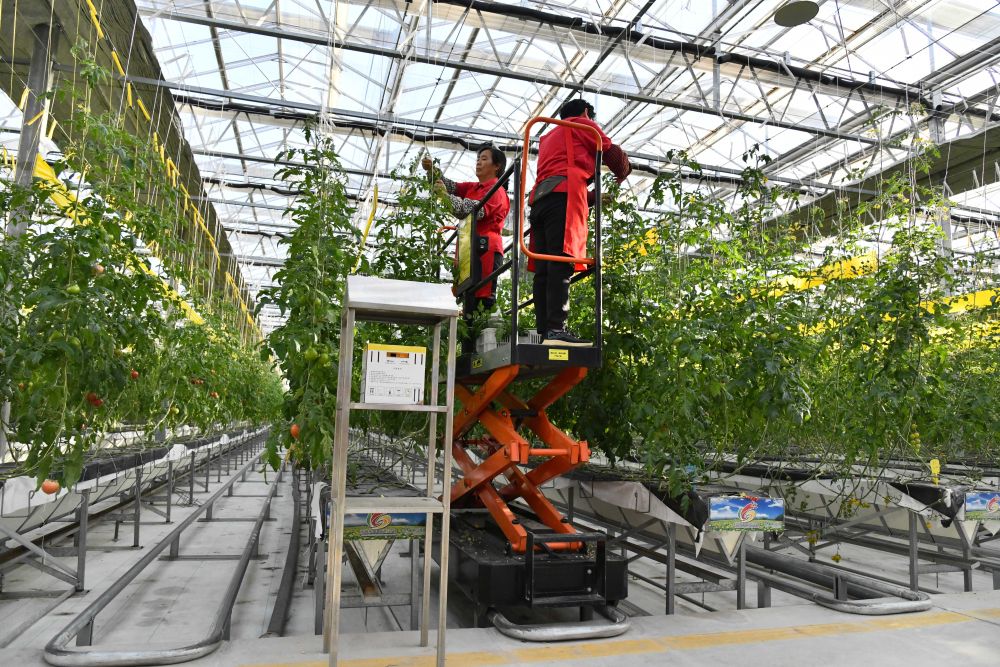 山东省潍坊市寒亭区,蔬菜种植户在智能温室大棚里进行春季管护作业(2024年3月19日摄)。新华社记者 徐速绘 摄