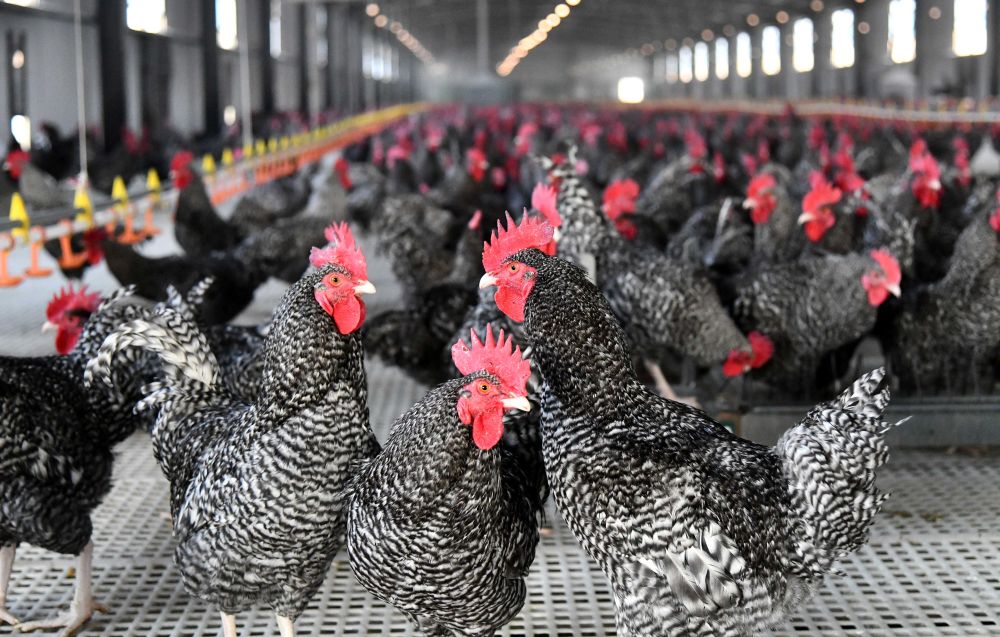 位于山东省汶上县的山东金秋农牧科技股份有限公司养殖场内饲养的芦花鸡(2024年3月12日摄)。新华社记者 徐速绘 摄
