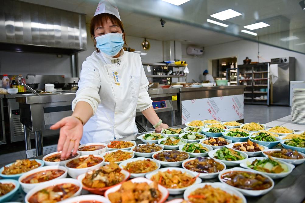 在新疆博乐市青得里街道东风社区百姓大食堂,工作人员给居民介绍菜品(4月10日摄)。新华社记者 丁磊 摄