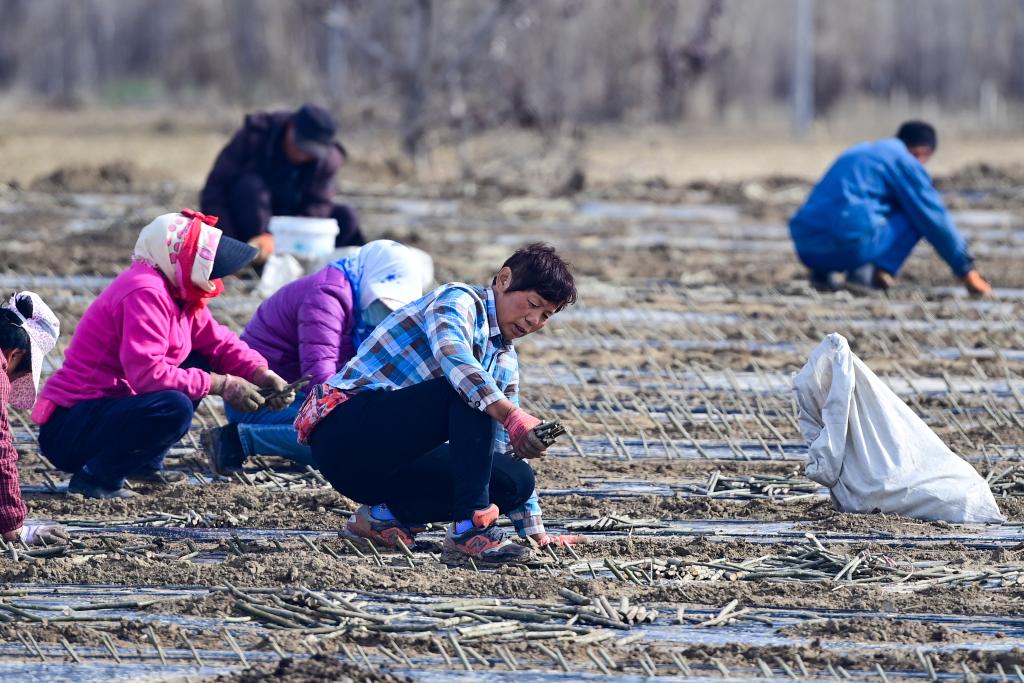 在新疆博尔塔拉蒙古自治州博乐市青得里镇定吉格村,村民在苗木基地扦插树苗(4月10日摄)。新华社记者 丁磊 摄