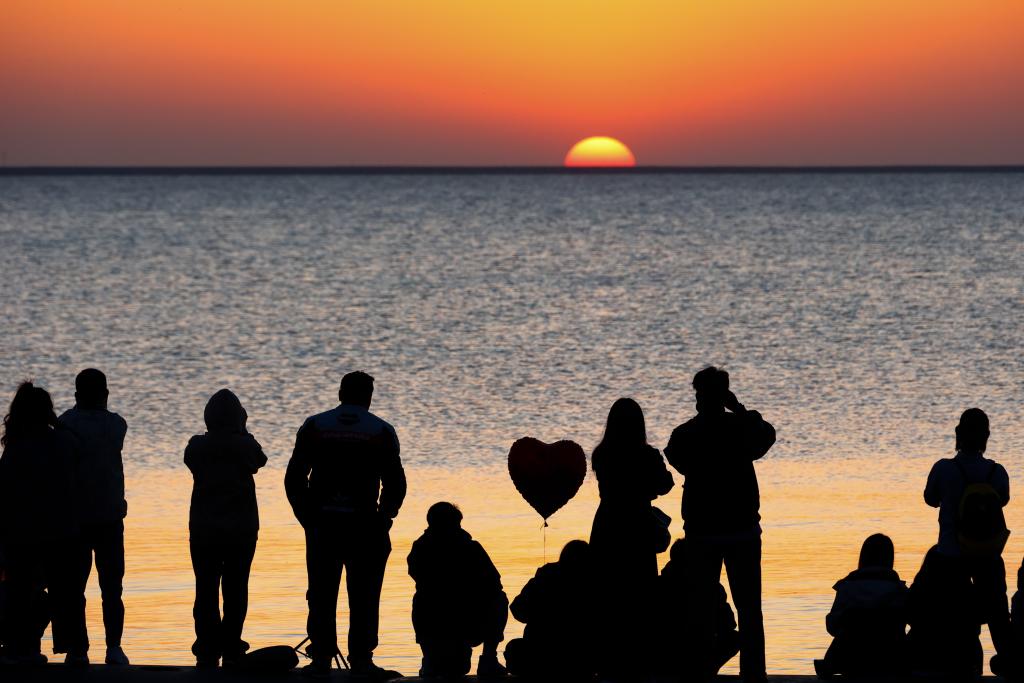 5月1日清晨,东疆亲海公园,游客在观赏海上日出。新华社发(杜鹏辉摄)