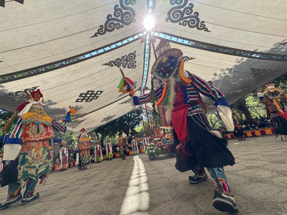 广场中央戏台上,鼓点轻快、钹声铿锵,戴着黄面白发面具的藏戏演员唱腔高亢激昂;台下,观众聚精会神,不时随着演员表演一起大笑。