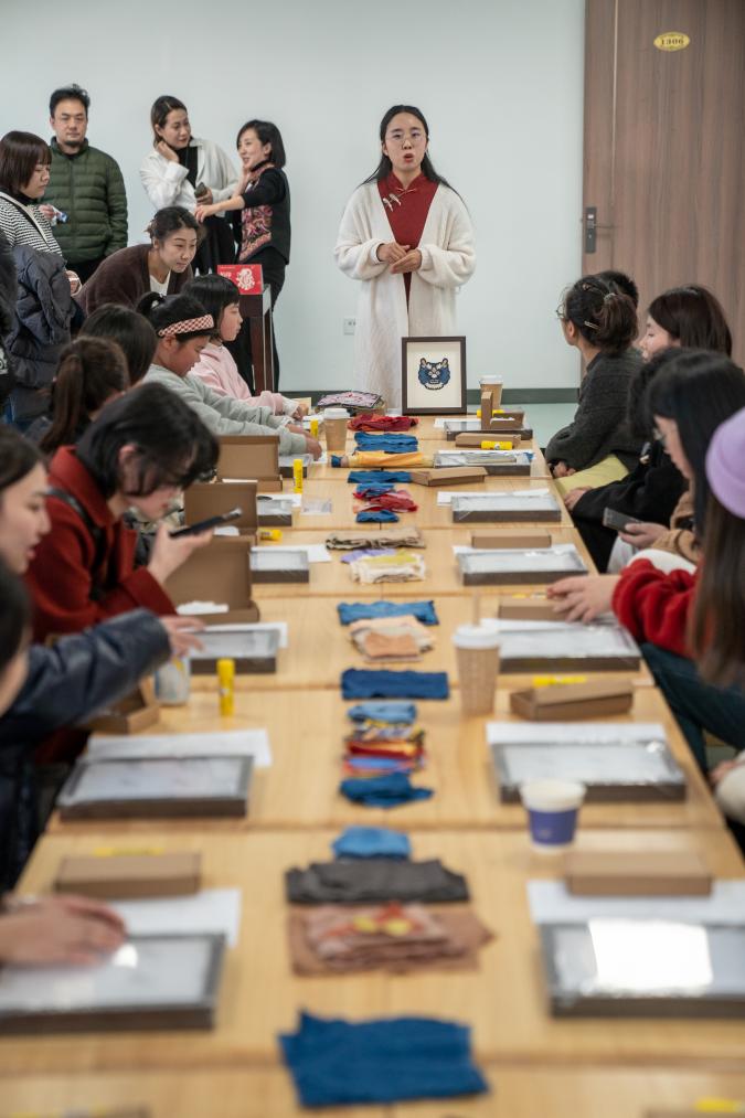2024年2月5日贵州省民族博物馆举办的龙年生肖展社交活动现场,群众在馆内老师带领下开展拼布、拓印等非遗手工体验活动。新华社发