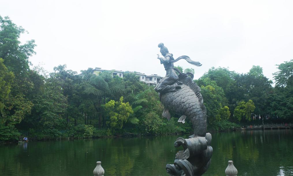 广西柳州鱼峰公园内,民间传说中“歌仙”刘三姐骑鱼升仙的雕像。 新华社记者 李欢 摄