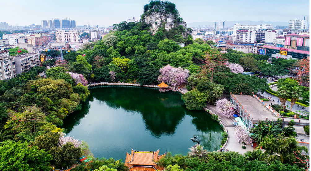 广西柳州鱼峰公园内的小龙潭与鱼峰山。(包华武 摄)