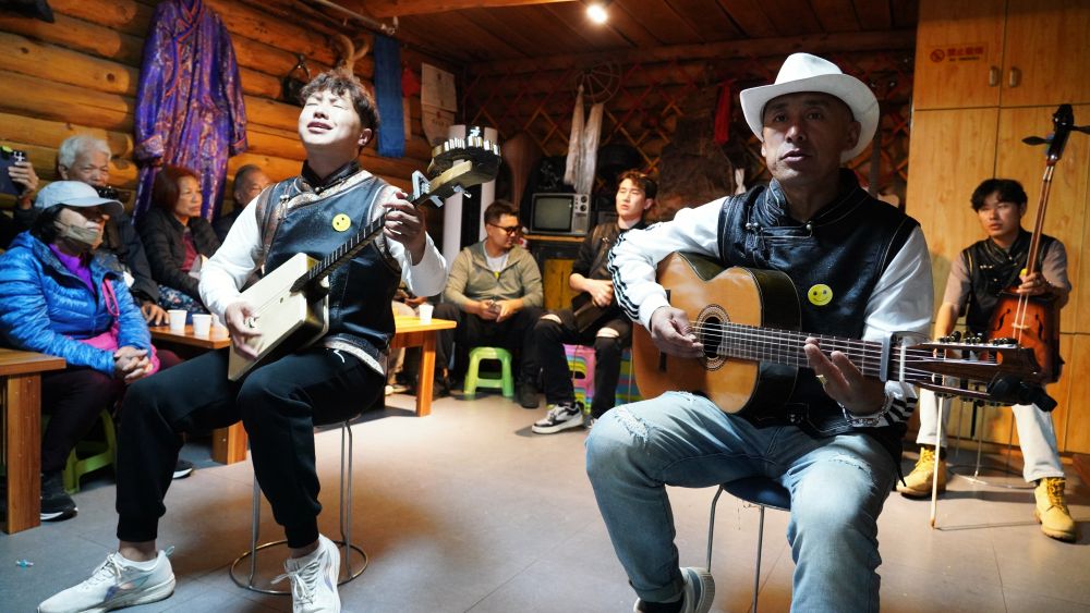 6月2日,在新疆喀纳斯景区家访点,乐队歌手为游客演唱。新华社记者 阿曼 摄