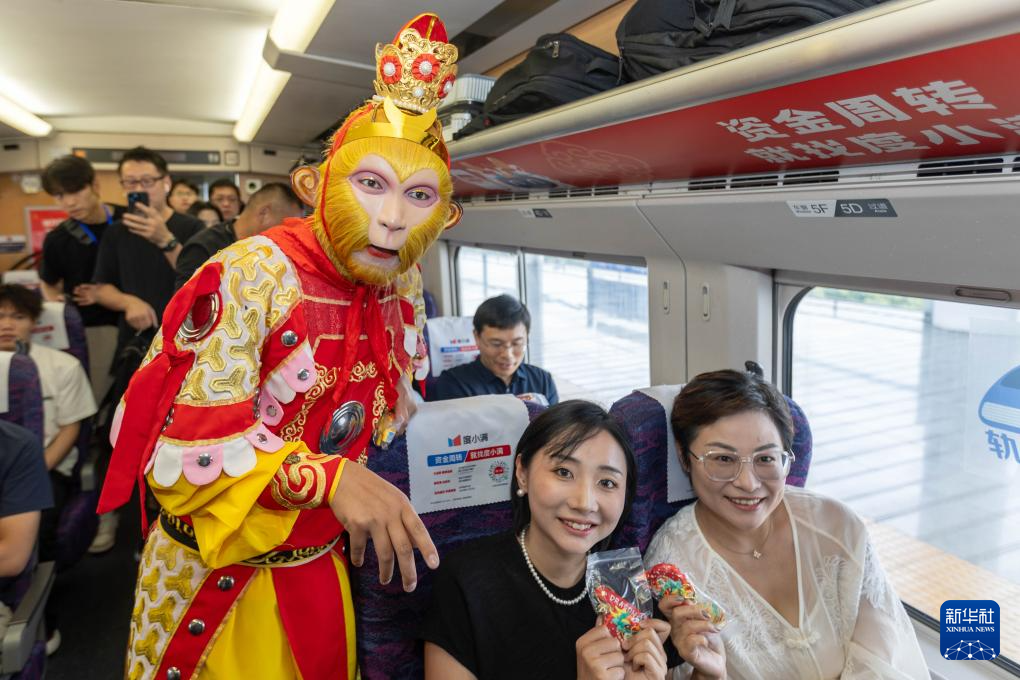 6月15日,在G8388次列车上,演员扮演美猴王为乘客送上纪念品。新华社记者 王翔 摄