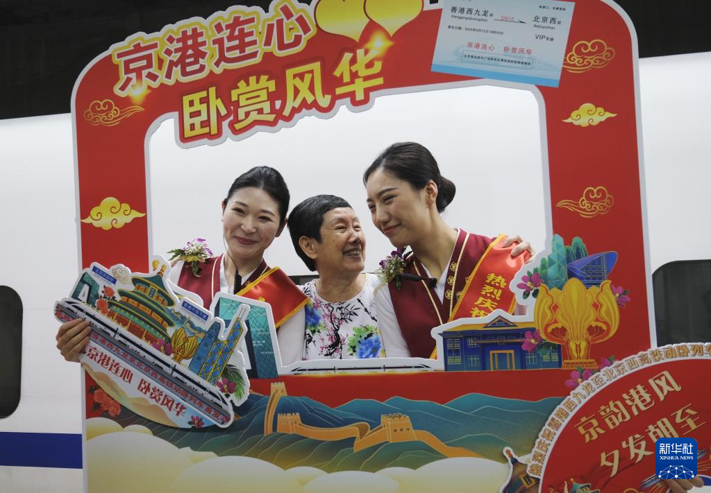 6月15日,乘坐香港西九龙至北京西D910次高铁动卧列车的旅客在香港西九龙站站台上拍照留念。新华社记者 王申 摄