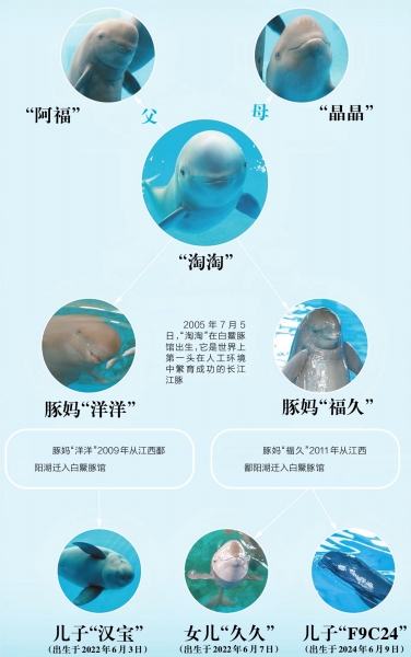 我在武汉白鱀豚馆生活了19年,2020年、2022年分别有了儿子“汉宝”,女儿“久久”。孩子们的名字寓意着在武汉出生的豚宝幸福长久。