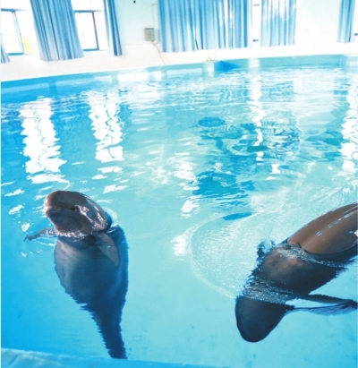 中国科学院水生生物研究所副研究员郝玉江介绍,即将迎来两周岁生日的“久久”活泼健康,体重42公斤,体长1.27米,是白鱀豚馆中的明星江豚。