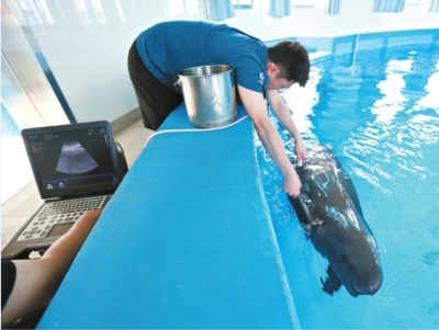 5月10日,科研人员在水中自然状态下做B超,“福久”跟饲养员配合默契。 摄影 高宝燕