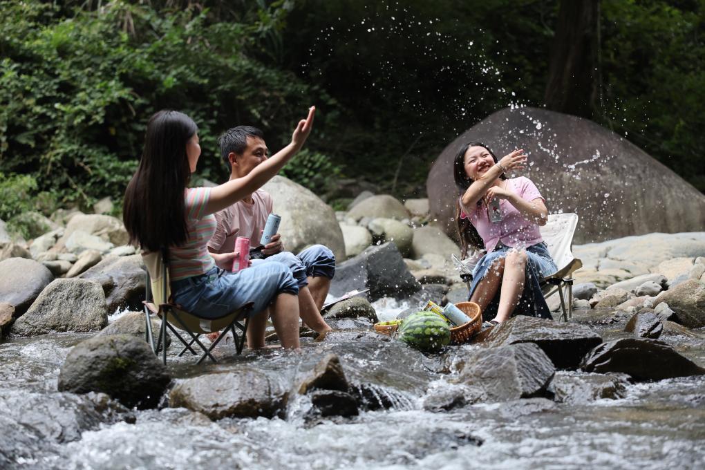 游客在江西省靖安县中源乡的溪流边避暑。(徐锦涛 摄)