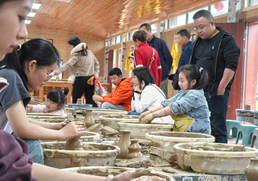 走进手工作坊,两排矮桌上,制陶转盘正在匀速旋转,前来体验的游客们举着一双双满是泥巴的手,时不时蘸点水,在制陶师傅们的帮助下,一团团黏软的黄黏土逐渐有了形状。