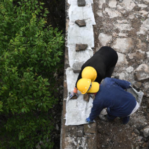 工人在箭扣长城121号敌台顶部进行考古清理(4月30日摄,无人机照片)。目前,该敌台已完成考古,进入修缮施工阶段。新华社记者 陈钟昊 摄