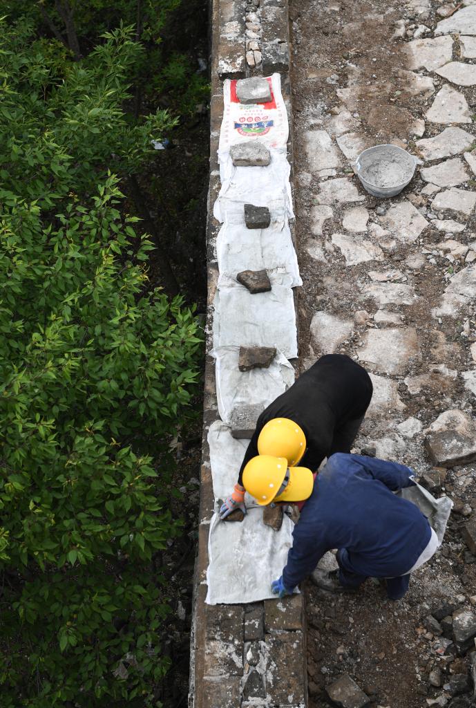 在箭扣长城122号敌台东侧墙体,工人给刚刚砌好的砖盖上编织袋遮雨(7月2日摄)。新华社记者 陈钟昊 摄