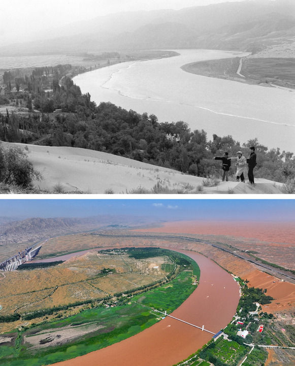 拼版照片:上图为1986年1月14日拍摄的腾格里沙漠与黄河交汇的景象(新华社记者施长江摄);下图为2024年7月5日拍摄的中卫市沙坡头旅游景区部分景观(新华社记者冯开华 摄)。