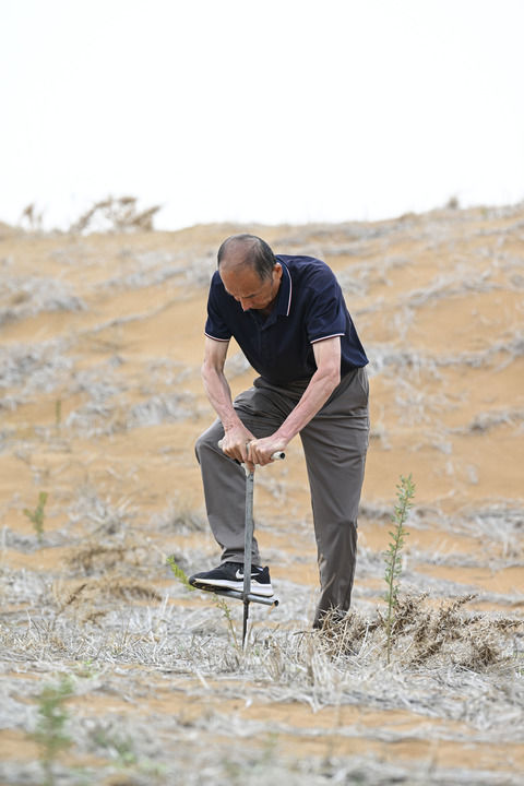 中卫市国有林业总场正高级林业工程师唐希明在演示他发明的“干”字形铁制植苗工具(6月1日摄)。除署名外本组图片均由新华社记者 冯开华 摄