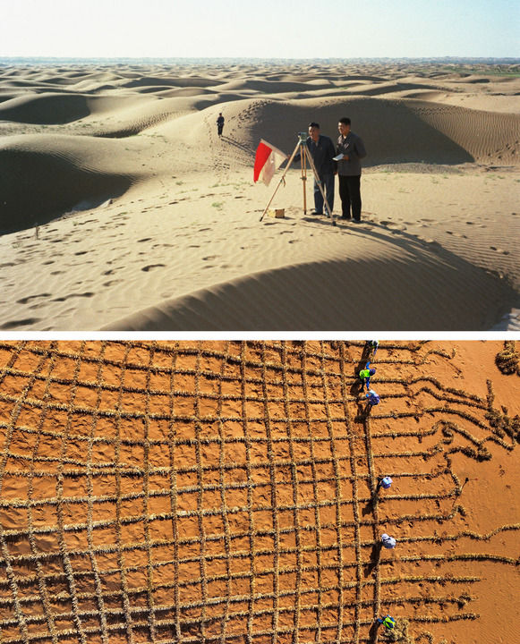 拼版照片:上图为宁夏中卫县(今中卫市)科技人员在腾格里沙漠测绘(新华社记者陈思禹 1992年1月20日 摄);下图为治沙工人在宁夏中卫市境内的腾格里沙漠铺设刷状网绳式草方格沙障(新华社记者冯开华 2024年5月30日摄)。