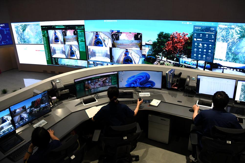 7月17日,在四川省都江堰水利发展中心,工作人员正在用“数字孪生平台”对洪峰过境进行数字预演分析。新华社记者 高健钧 摄