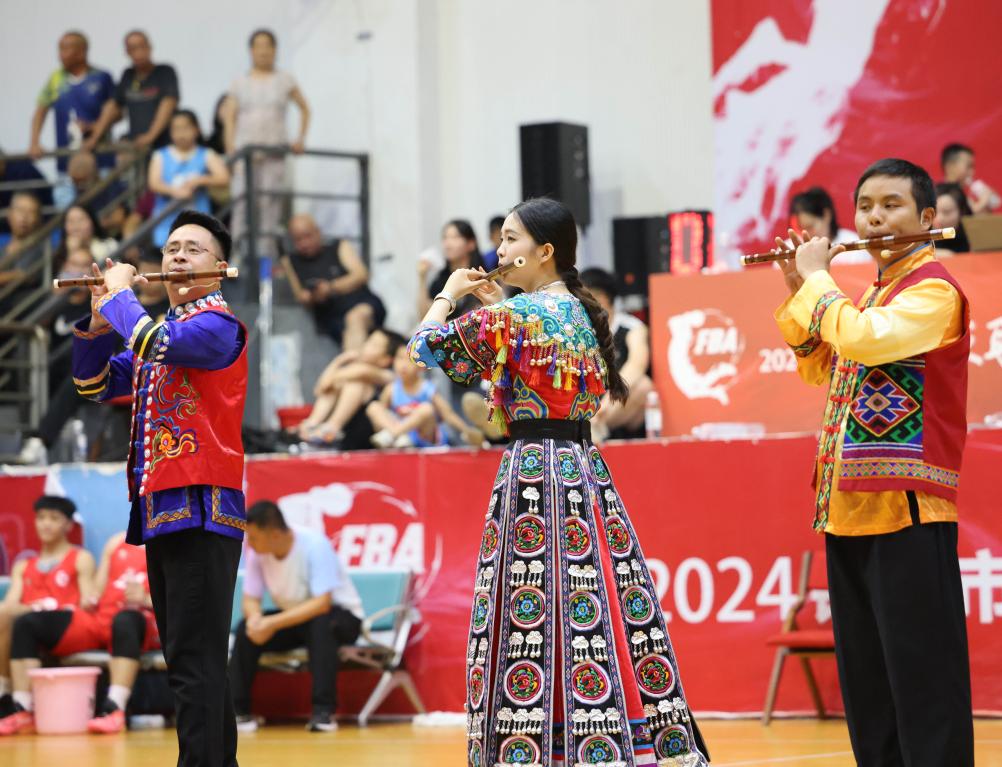 7月29日,年轻艺人在贵州省玉屏侗族自治县体育馆吹奏箫笛。新华社发 (胡攀学摄)
