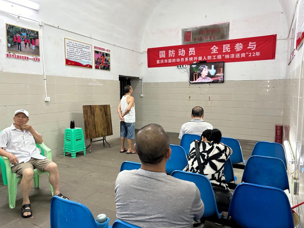 “这里有桌椅、电视、茶水,外面快40摄氏度,这里都不到25摄氏度。”年近八旬的重庆沙坪坝区居民陆大爷,自打今年暑期高温以来,天天带着自己的蒲扇和茶水杯,到家附近的光荣坡11号人防工程纳凉点避暑,和街坊邻居聊天,一坐就是一下午。