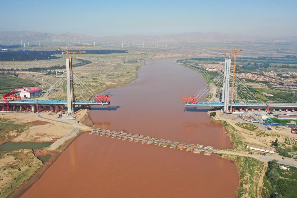 这是8月23日拍摄的包银高铁乌海黄河特大桥建设现场(无人机照片)。新华社记者 李志鹏 摄