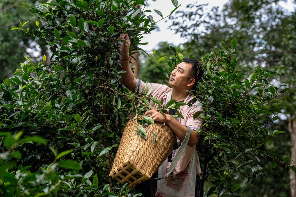 9月13日,云南景迈山翁基古寨茶农扎约在自家的古茶园里采茶。新华社记者胡超 摄