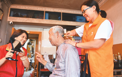 河南省洛阳市涧西区积极构建“嵌入式”养老服务体系,为老年人提供养老助餐、社区娱乐、健康管理、上门保洁等综合养老服务项目,让老人在家门口享受全方位养老。图为涧西区武汉路街道秦岭路社区,养老服务中心护理员和社区志愿者为居家老人理发。黄政伟摄(人民视觉)